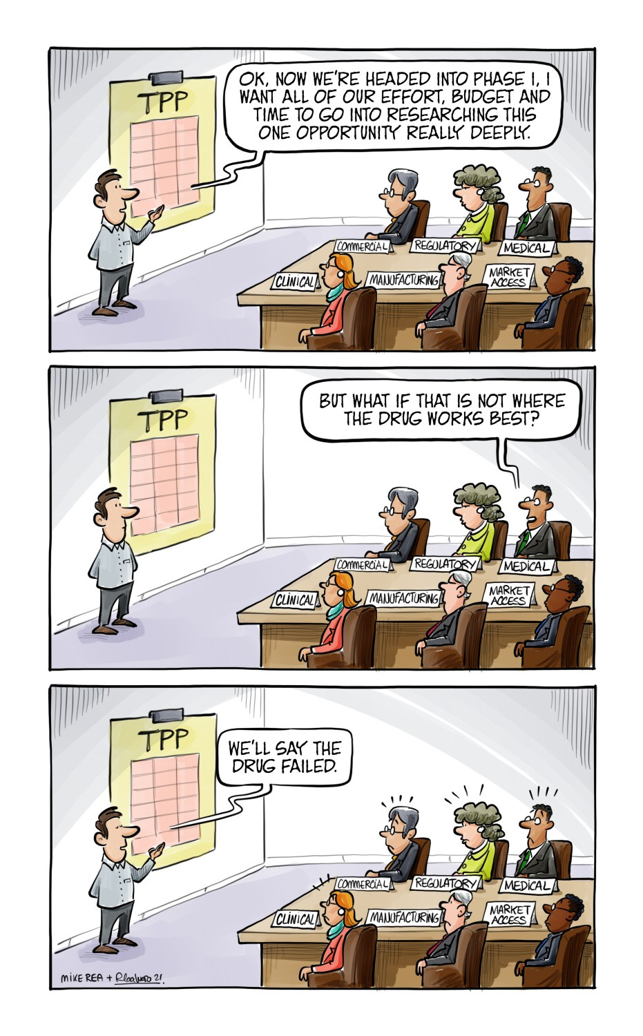 What if, for example, you'd like to know the opportunity and risk profiles for 20 or 30 different launch opportunities (which is a reasonable number for most assets we look at)? Would you like to run a traditional exercise across all 30? No. You couldn't afford the time or the budget. Instead, companies then opt to do it for 2 or 3 at most, knowing that they're ignoring more interesting 'what ifs' in search of boring predictability. However, you could make good estimates of most important parameters for 20-30 options in one afternoon, with the right people working together. Which of those approaches is more likely to lead to an interesting choice of launch option? You may have wide confidence intervals on your estimates, but that's OK - you know how to increase your confidence in any of those assumptions. If you opt for the long, drawn out process, you may have great confidence, but only in something that will never happen - the risk was all baked into the selection of that one TPP.