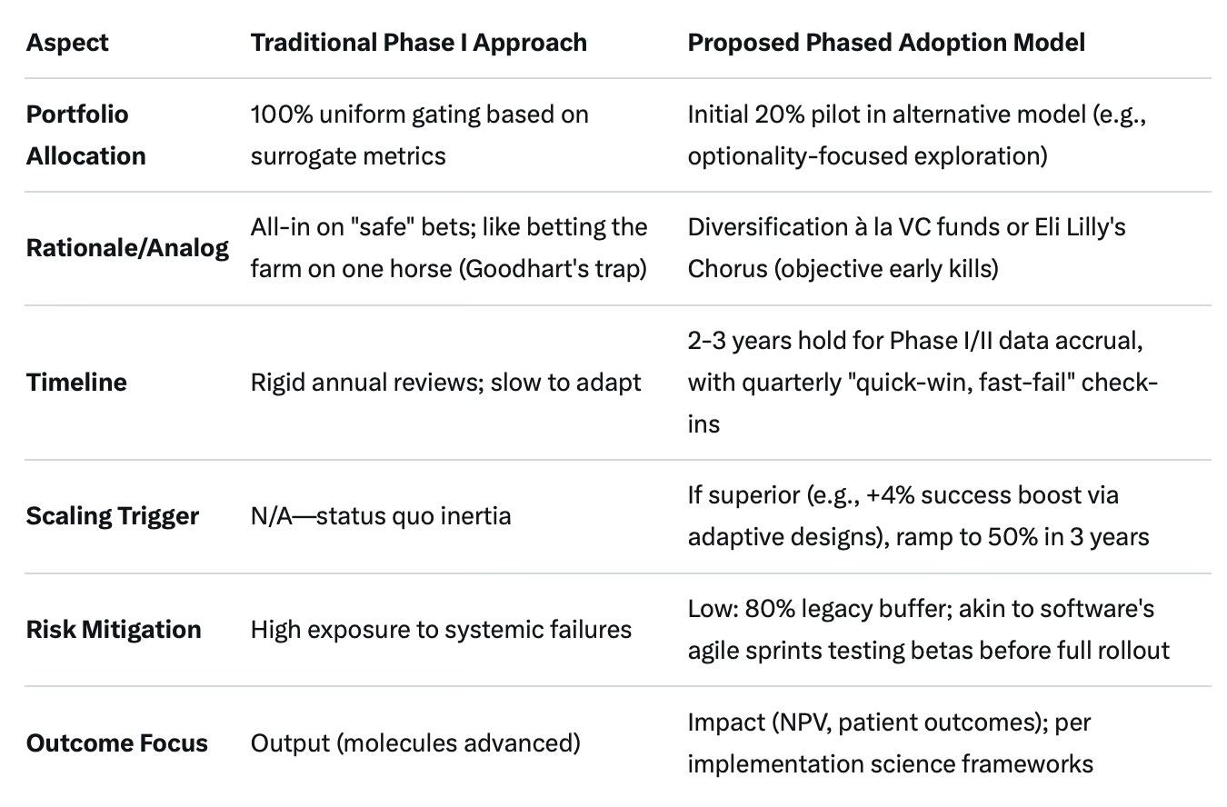Initially, allocate 20% of the Phase I portfolio to the alternative model, drawing from diversification strategies in high-risk areas like oncology where a 1-in-5 success rate demands spreading bets across multiple candidates to mitigate failure risks. This isn’t blind faith - it’s a controlled experiment, echoing how AstraZeneca’s 5R framework or Eli Lilly’s Chorus model uses objective early-stage assessments to cull the weak without mercy. (I believe it’s now 6Rs…) The percentage allows meaningful piloting without overexposing the overall portfolio, enabling data collection on the model’s performance in real-world Phase I/II settings while maintaining traditional approaches for the majority - much like how banks post-2008 stress-tested 20% of assets under new regulations before full Basel III adoption, avoiding a Lehman-style implosion.