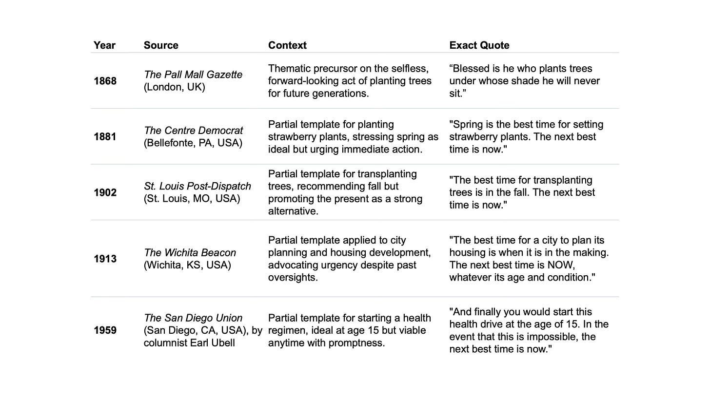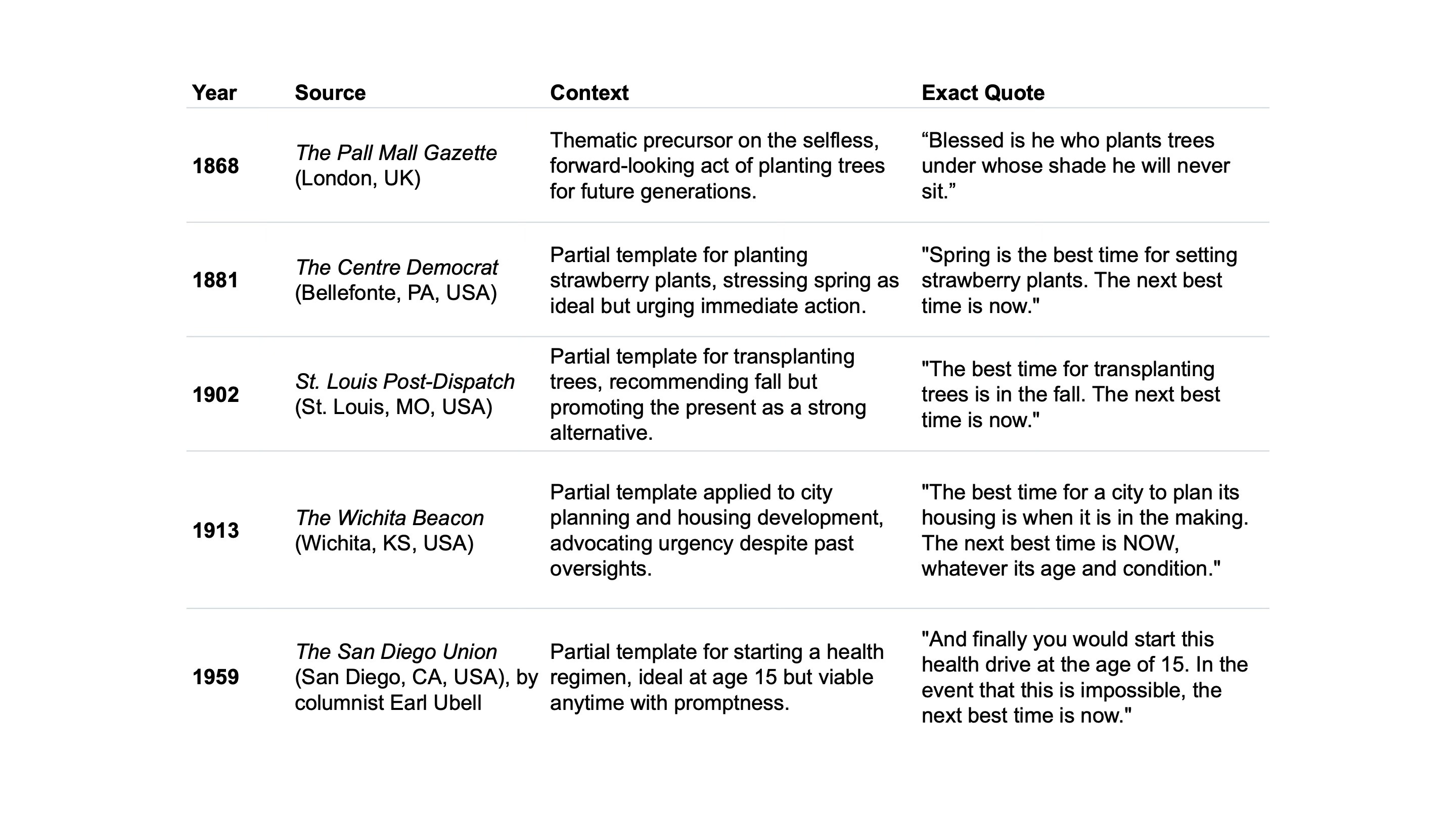 Related ideas about long-term planting date back further. For instance, a 1868 piece in London’s The Pall Mall Gazette noted: “Blessed is he who plants trees under whose shade he will never sit.” Partial matches (e.g., “the best time to do X was Y years ago; the next best is now”) appeared in U.S. newspapers as early as 1881 (for strawberry plants), 1902 (for transplanting trees), and 1913 (for urban planning).