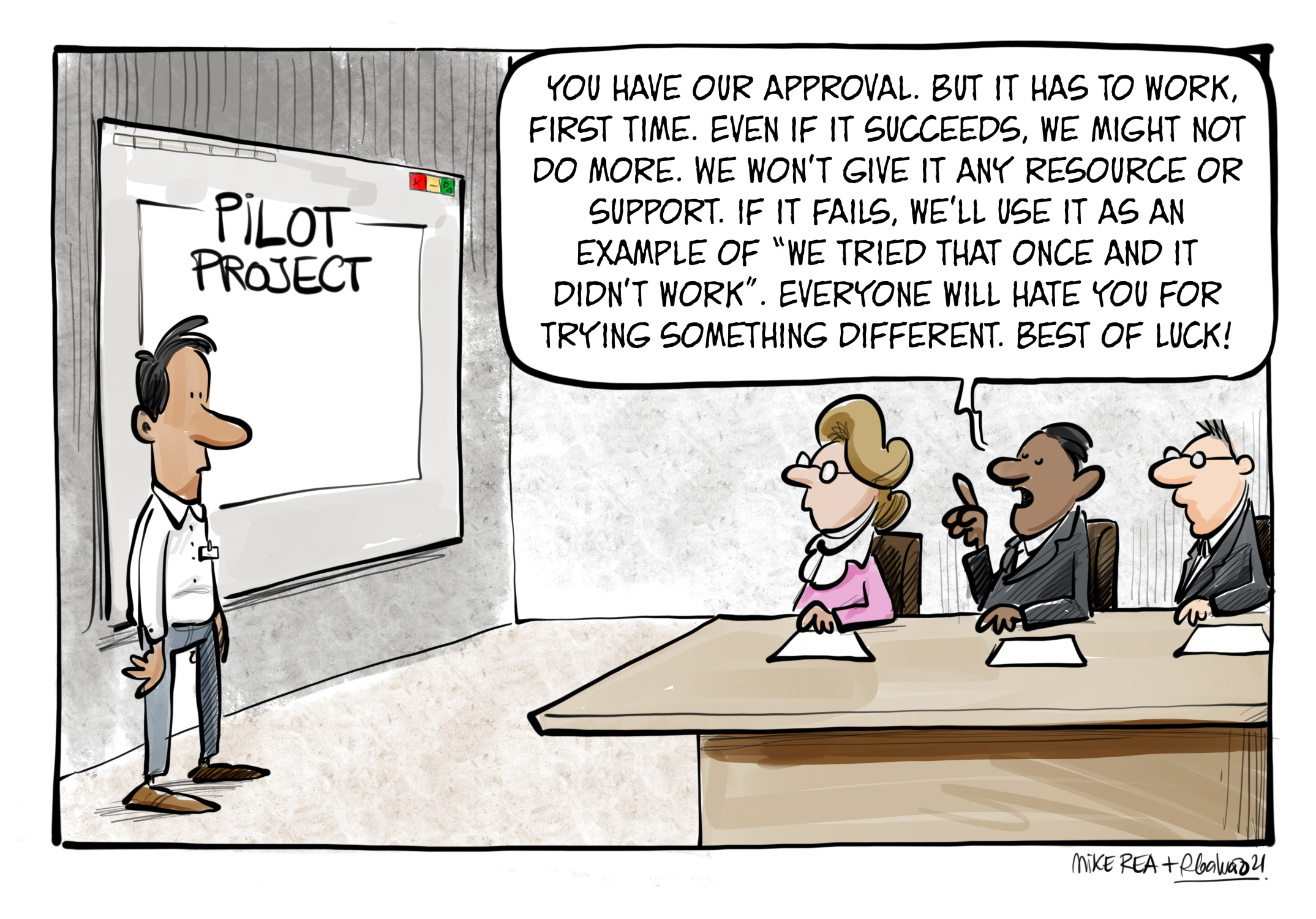 Embracing pilots is a key behaviour of an innovation-oriented company. We describe it as opportunity-seeking behaviour. Great companies know that sometimes you can only learn by doing. But 'doing' in a particular way - to understand why something did work, or understand why it might not have, is critical. With that knowledge, you're in a place that the no-pilot companies couldn't be. What is also a key behaviour is conducting those pilots in the right spirit. Typically, as I've written before, people don't need a process to be more innovative, they need permission. If a pilot is succeed or fail, the predominant motivation will be to avoid failure. So, easier wins will be sought. Why would you try too hard to do something meaningful if you'll be dinged for failure, and barely rewarded for a success?