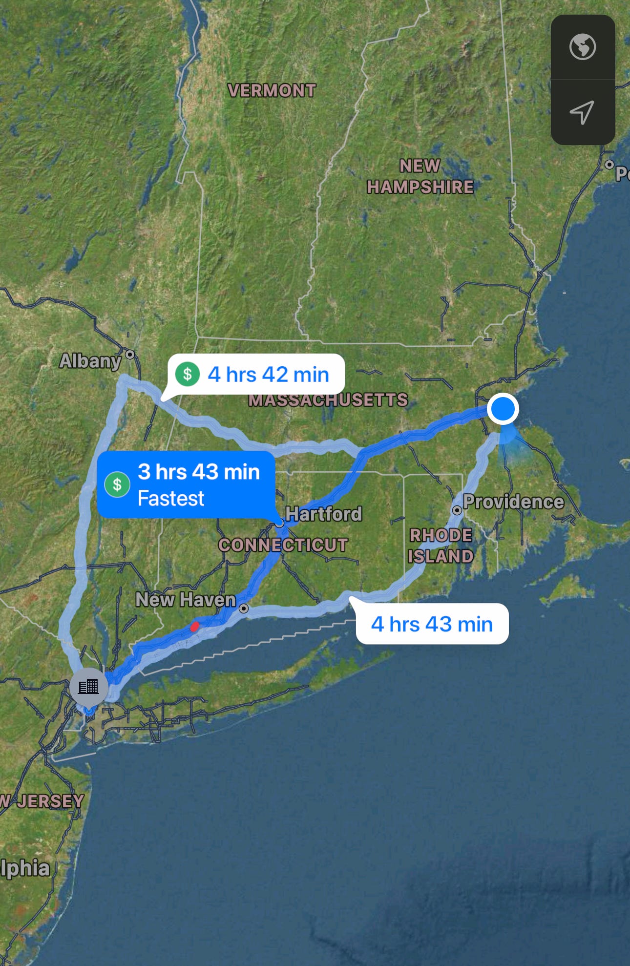 If you plug ‘Boston to New York’ into Apple Maps, it will give you route options, bearing in mind known knowns (available roads), known unknowns (typical traffic level variability) and more… You can choose on the basis of cost, difficulty of the road and more. Options are good, and Apple Maps quite reasonably doesn’t choose a single route for you.